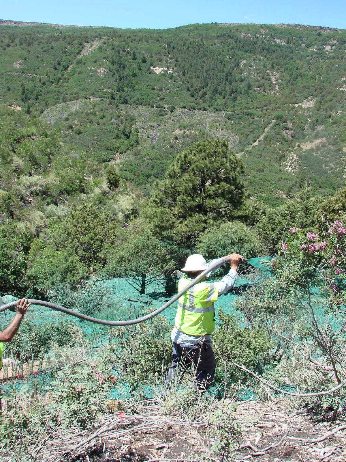 Hydroseeding typically consists of applying a mixture of wood fiber, seed, fertilizer, and stabilizing emulsion with hydro-mulch equipment, which temporarily protects exposed soils from erosion by water and wind